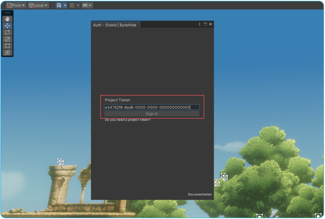 To authenticate with ByteHide Shield for Unity, you need to enter your PROJECT TOKEN in the corresponding field and click on the Sign In button.